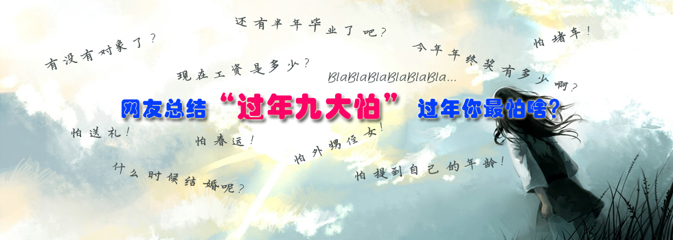 近日,在微博、贴吧,均有一则题为“过年九大怕”的帖子被网友连续转帖,这一帖子似乎道出了当今社会许多“80后”年轻人的心声,“怕年终奖少”排在了首位。由此,“怕催婚、怕被问学习、怕送礼”等之类的关于“过年你最怕什么”的话题,成为了人们年前热议的事,有人说了... 详细>>